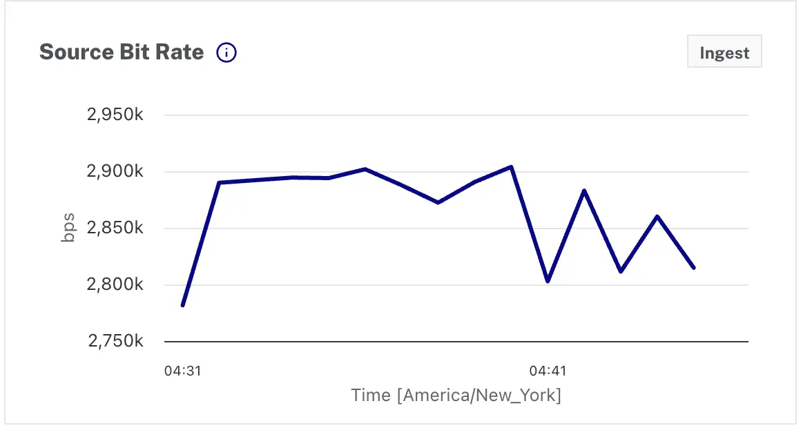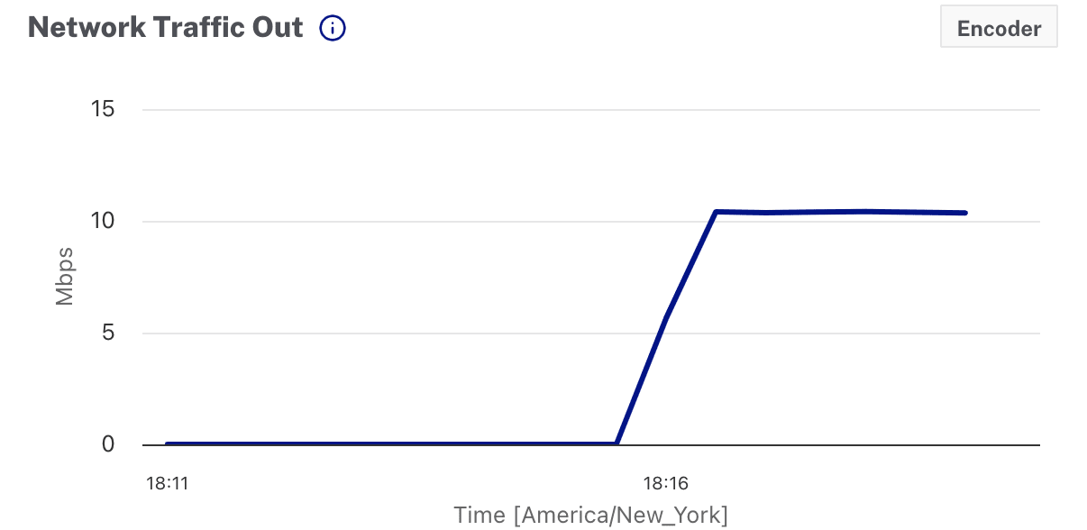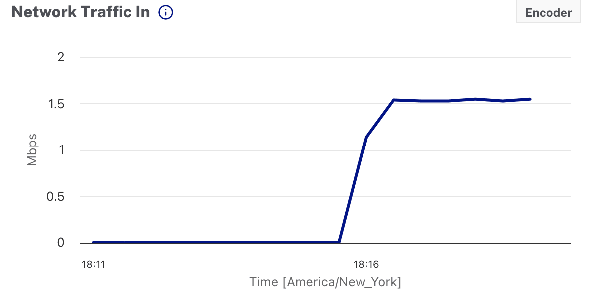 - Network Traffic In - Rate of network traffic coming into the encoder. Includes all ingest traffic received—push inputs, pull inputs, responses from upstream systems and downstream systems, and instance traffic such as DNS resolution and NTP. Even when an encoder is not ingesting, there will be some traffic.